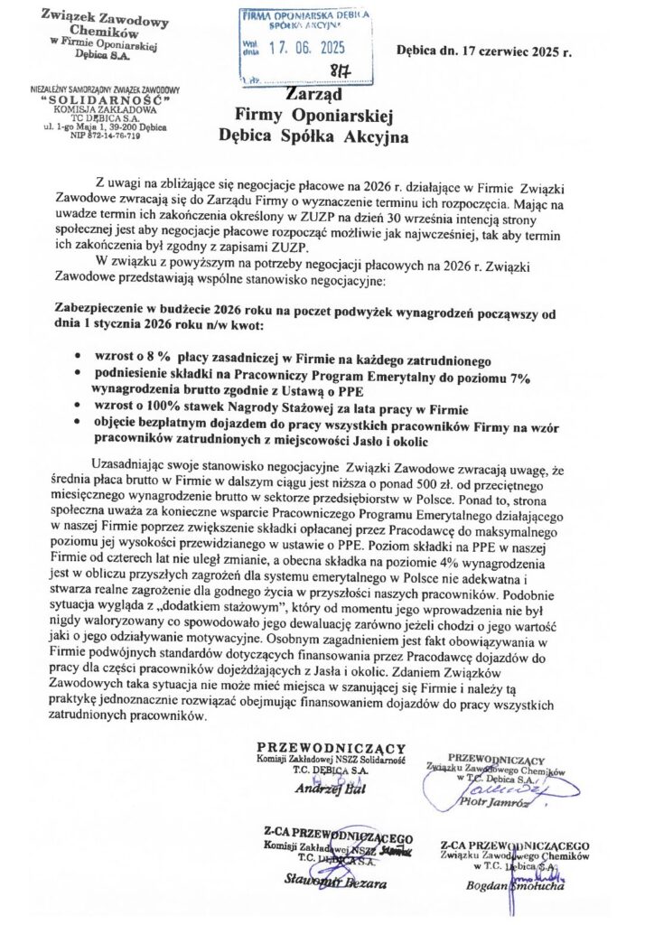 Z uwagi na zbliżające się negocjacje płacowe na 2026 r. działające w Firmie Związki Zawodowe zwracają się do Zarządu Firmy o wyznaczenie terminu ich rozpoczęcia. Mając na uwadze termin ich zakończenia określony w ZUZP na dzień 30 września intencją strony społecznej jest aby negocjacje płacowe rozpocząć możliwie jak najwcześniej, tak aby termin ich zakończenia był zgodny z zapisami ZUZP.